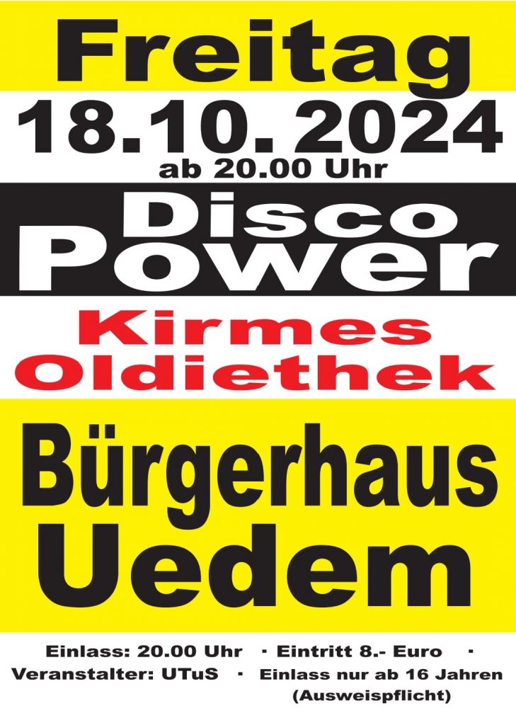 Wie jedes Jahr trifft die genüssliche UTuS-Getränkekarte wirklich jeden Geschmack und keiner muss durstig feiern. Aber neben der Zunge kommen auch die Ohren voll auf ihre Kosten. Auch in diesem Jahr liefern die Jungs von Disco Power mit ihrem schier unerschöpflichen Fundus der größten, beliebtesten und vor allem tanzbaren Hits der letzten 50 Jahre. Von Tina Turner bis Taylor Swift, von den Rolling Stones bis 3 Doors Down und von Cher bis Helene Fischer – für jeden ist was da bei. Also – kommt vorbei und lasst uns zusammen den Beginn der Uedemer Fliegenkirmes gebührend feiern.